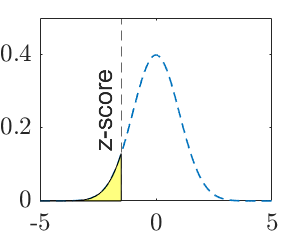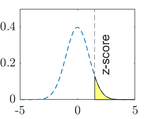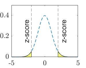 z-score: Once we collected data points and calculated sample means, they are two specific numbers, which are denoted by lowercase \(\bar x\) and \(\bar y\). The calculated value of test statistic is called z-score, which is an instance of the test statistic for a specific data set, \[ z=\frac{(\bar x-\bar y)-\Delta}{\sqrt{\frac{\sigma^2_1}{m}+\frac{\sigma^2_2}{n}}}. \]