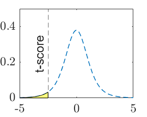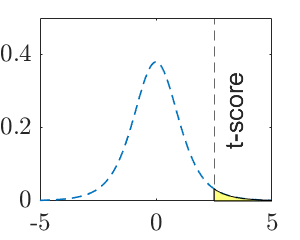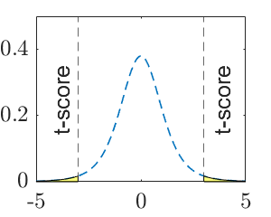 For \(t\)-tests, the instances of the test statistic (after evaluated by a specific sample) are called \(t\)-scores \[ t=\frac{(\bar x-\bar y)-\Delta}{\sqrt{\frac{s^2_1}{m}+\frac{s^2_2}{n}}}. \]